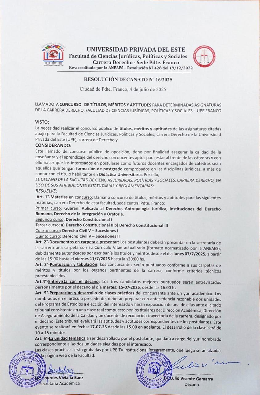 Llamado a Concurso de Título, Méritos y Aptitudes Res. 16/2025
